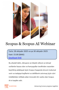 28 və 30 oktyabr 2025-ci tarixlərində Saide Sak, Elsevier şirkətinin Scopus üzrə menecerinin rəhbərliyi ilə Scopus və Scopus AI platformaları üzrə onlayn təlim keçiriləcək.İştirakçılar dünyanın ən nüfuzlu elmi məqalə və istinad bazalarından biri olan Scopus platformasında səmərəli naviqasiya bacarıqlarını öyrənəcək, genişləndirilmiş axtarış alqoritmlərindən istifadə qaydalarını mənimsəyəcək və süni intellekt texnologiyalarına əsaslanan Scopus AI alətinin imkanları ilə tanış olacaq.