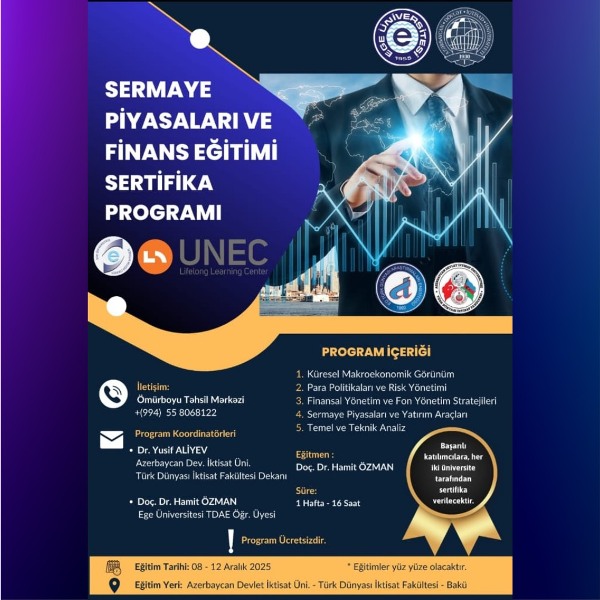 8-12 dekabr 2025-ci il tarixlərində EGE Universitetinin dosenti Dr. Hamit Özman tərəfindən “Səhm Bazarları və Maliyyə Savadlılığı” mövzusunda sertifikat proqramı keçiriləcək.