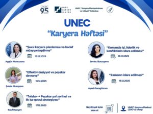 UNEC tələbələrinin şəxsi və peşəkar inkişafını dəstəkləyən növbəti genişmiqyaslı təşəbbüsə imza atır.15–19 dekabr tarixlərində keçiriləcək Karyera Həftəsi tələbələrə real əmək bazarının tələbləri ilə tanış olmaq, peşəkar mütəxəssislərlə ünsiyyət qurmaq və gələcək karyeralarını strateji şəkildə planlaşdırmaq imkanı yaradacaq.