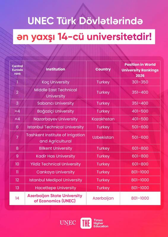 Ümumilikdə, 109 universitetlə reytinqdə ən çox təmsil olunan ölkə Türkiyədir. Reytinq Türk Dövlətləri Təşkilatının 5 üzv dövlətini – Azərbaycan, Qazaxıstan, Qırğızıstan, Türkiyə və Özbəkistanı əhatə edən THE Dünya Universitetləri Reytinqi 2026-nın filtr edilmiş versiyasıdır. Qiymətləndirmə universitetlərin əsas missiyaları üzrə 17 çəkili indikator əsasında aparılıb.