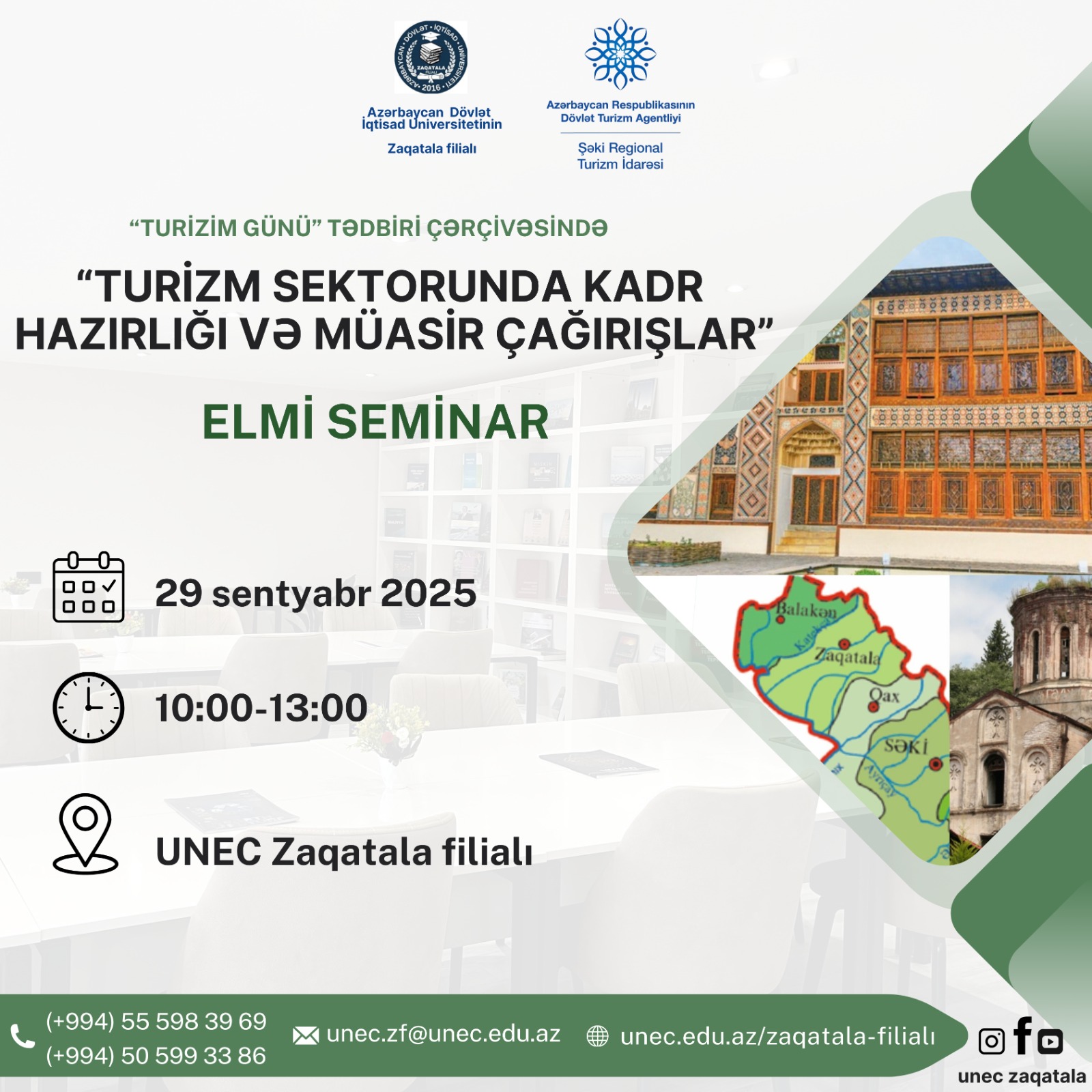 Seminar Azərbaycan Dövlət İqtisad Universitetinin Zaqatala filialı və Şəki Regional Turizm İdarəsinin birgə təşkilatçılığı ilə 29 sentyabr 2025-ci il tarixində baş tutacaqdır.